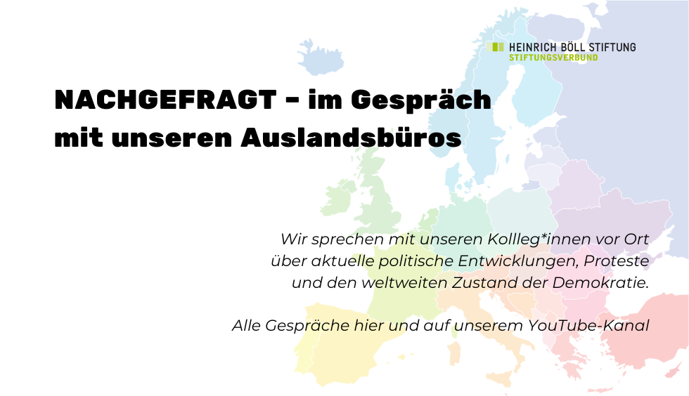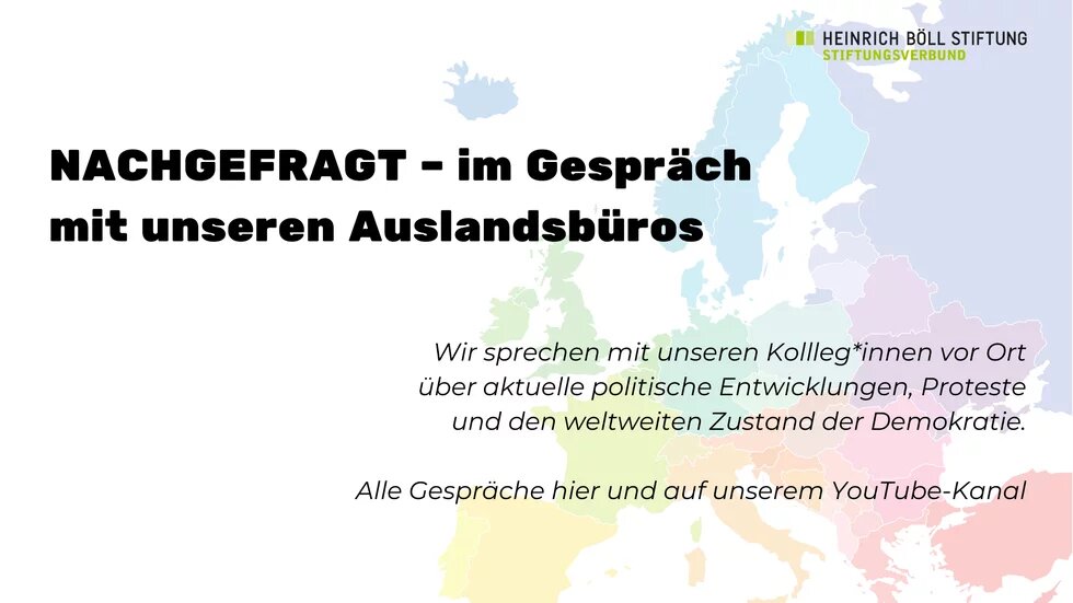 Die Veranstaltung ist Teil der Reihe ‚Nachgefragt - Gespräche mit unseren Auslandbüros‘ im Heinrich-Böll-Stiftungsverbund. In dem Format treffen wir uns in regelmäßigen Abständen mit den Leitungen (oder Mitarbeitenden) der Auslandbüros der Heinrich-Böll-Stiftung, um mit Ihnen auf aktuelle Entwicklungen im jeweiligen Land zu blicken. Als Expert*innen vor Ort ordnen sie die aktuellen Geschehnisse ein und sprechen mit uns darüber, warum die Ereignisse auch für uns von Bedeutung sind.